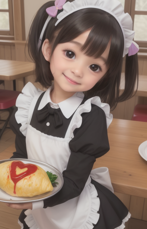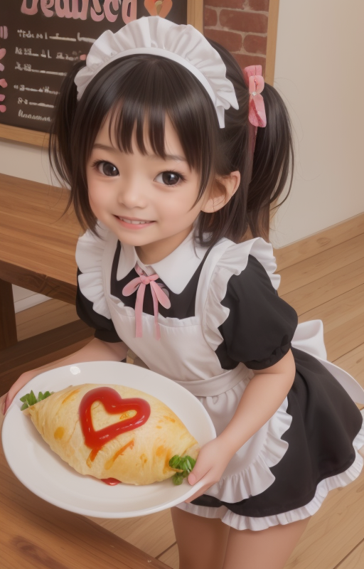 A maid cafe staffed by a tiny AI girl. The popular menu item is an omelet rice made with lots of love♡